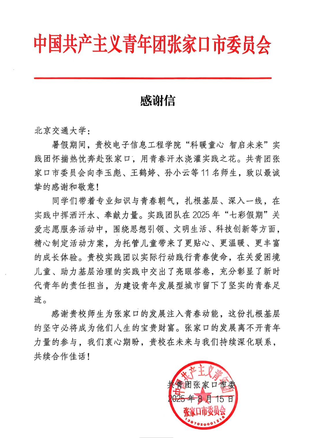 为深入贯彻习近平新时代中国特色社会主义思想,落实党的二十大精神,共青团张家口市委发起2025年“七彩假期”志愿服务。由太阳成集团网址电信学院励志社10名本科生骨干组成的“科暖童心 智启未来”实践团积极响应号召,学院辅导员李玉彪老师全程指导。团队于8月11日至17日走进张家口市,围绕困境儿童、留守儿童群体开展精准关爱行动。