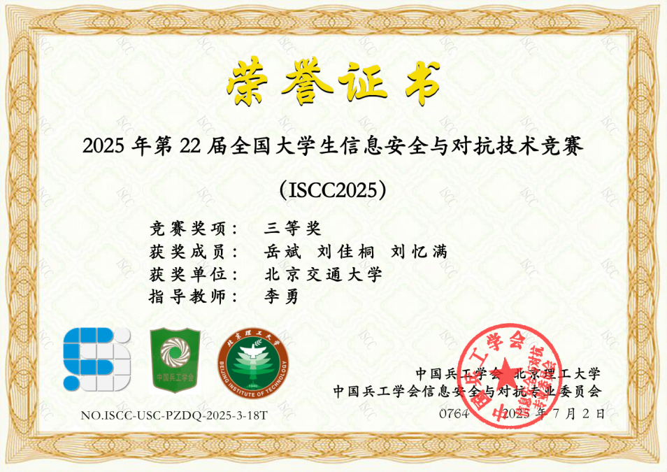 2025年第22届全国大学生信息安全与对抗技术竞赛(简称ISCC)圆满落幕。我校共组织来自电信学院的8支队伍共24名同学参加“线上挑战赛”(破阵夺旗赛)。其中4支队伍通过校级赛成功晋级区域赛和总决赛。最终,1支队伍获得全国三等奖(获奖队员:岳斌、刘佳桐、刘忆满,指导教师:李勇)。这是电信学院第一次组织参加该项赛事,实现赛事获奖“零”的突破。